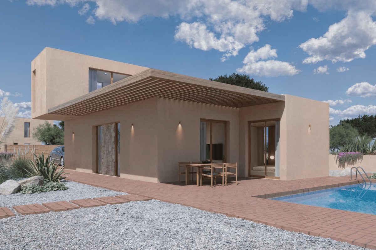 DUNA is a two-story home that reinterprets the Mediterranean style with a solid and luminous presence. Its design combines simple volumes with traditional materials such as dry stone, used on the façade to provide texture, identity, and a natural integration with the surroundings. The ground floor is the setting for everyday life: an open, well-proportioned space integrating the living room, dining room, and kitchen, with generous windows that connect to the garden and allow light to flow in all directions. The auxiliary bedrooms are organized on this level, facilitating flexible and comfortable use of the space. The upper floor is reserved for the master suite, conceived as a tranquil, elevated retreat. It features its own bathroom, dressing room, and a terrace from which to contemplate the landscape in privacy. This vertical layout provides functional clarity and architectural value to the whole. The combination of traditional masonry, earthy colors, and contemporary elements makes DUNA a home with a Mediterranean soul and a contemporary sensibility. A project where architecture and location intertwine with harmony and character.