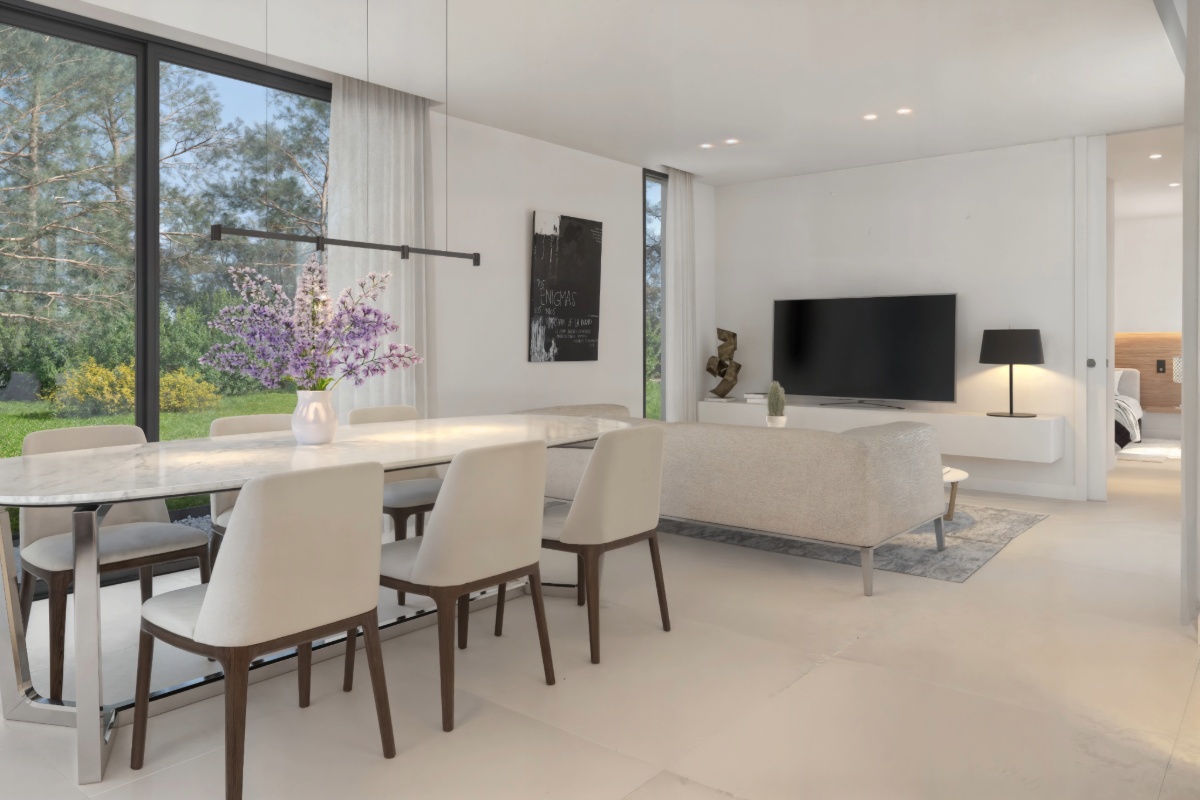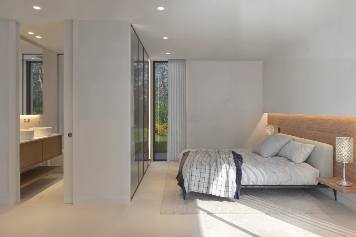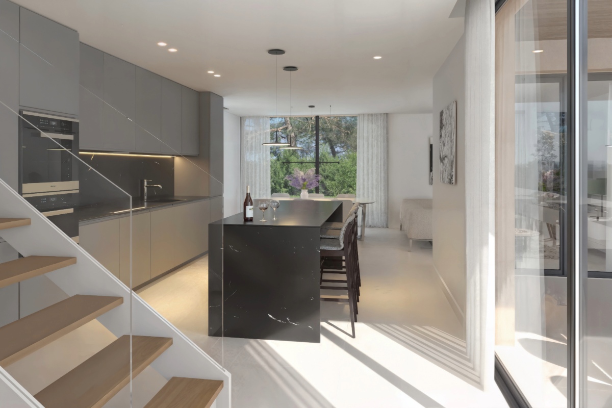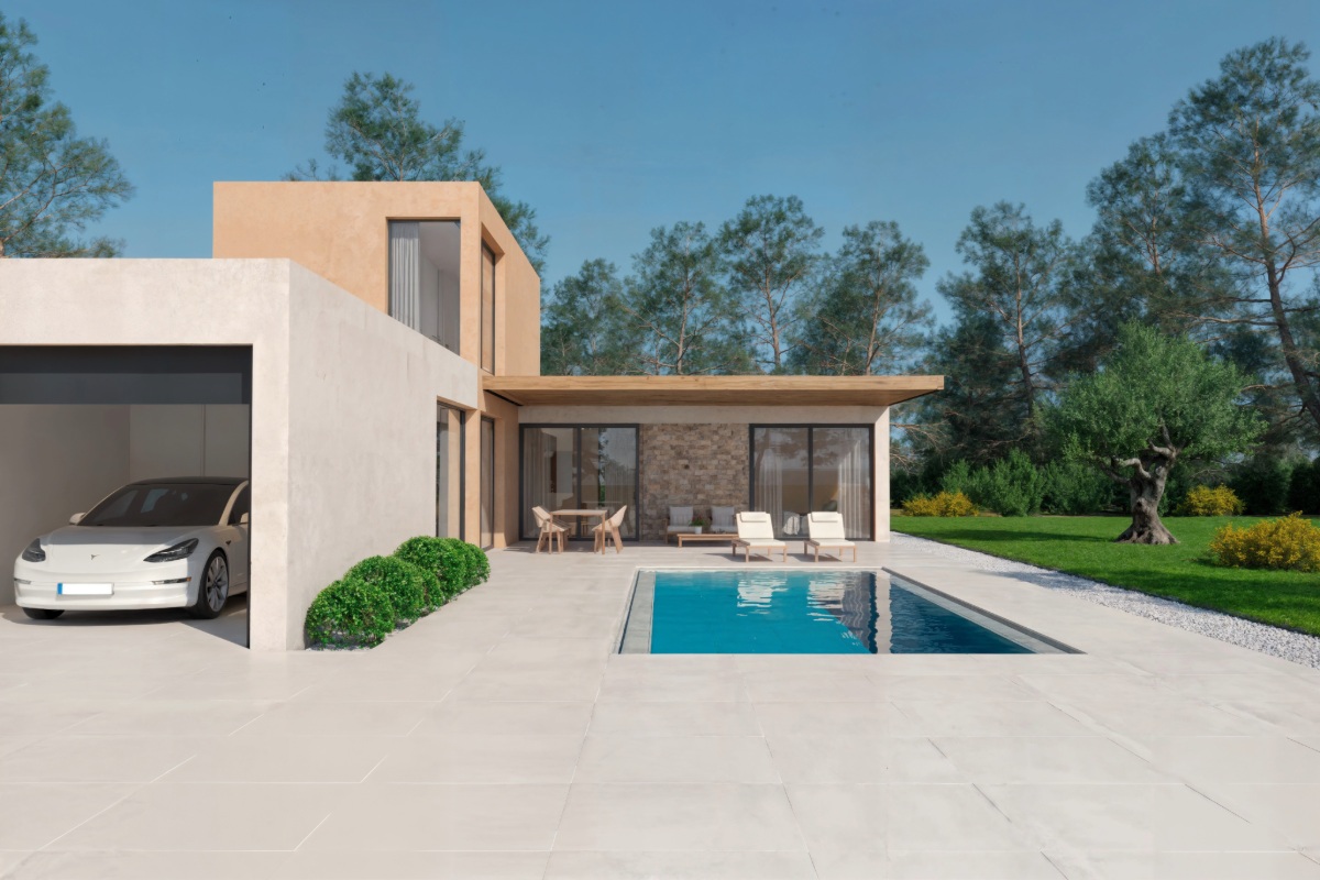 ELVA is a two-story home that combines contemporary elegance and functional balance in an architecture defined by contrast. Its two-tone façade—which alternates mineral textures and neutral tones—brings rhythm and personality to the complex, reinforcing its modern character without being too strident. On the ground floor, the living spaces—living room, dining room, and kitchen—are arranged in a single open space that projects toward the garden and extends through a wooden pergola that frames the pool area. This smooth transition between interior and exterior turns the porch into a habitable space for much of the year. The garage, discreetly integrated into the main volume, completes the floor plan with functionality.
