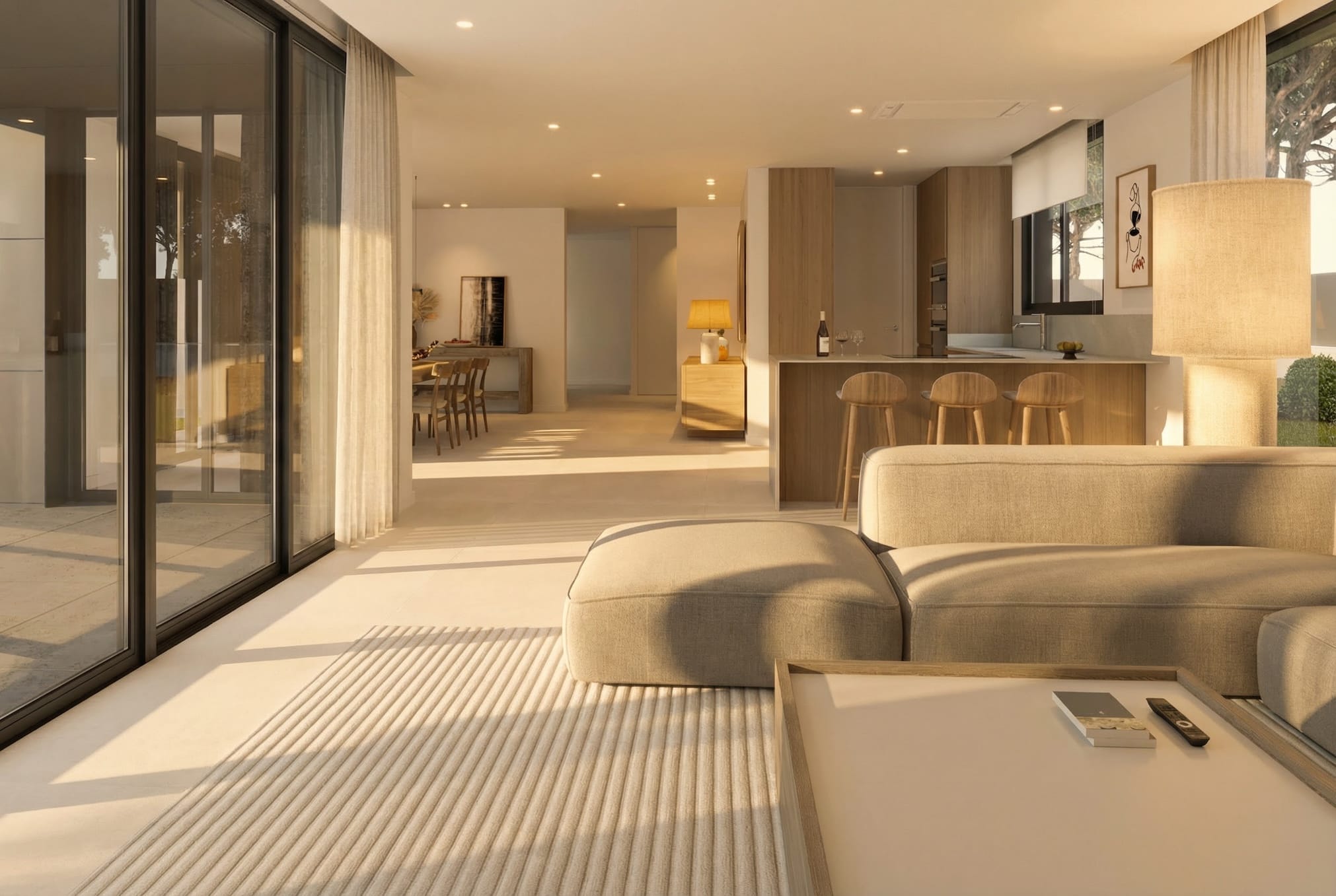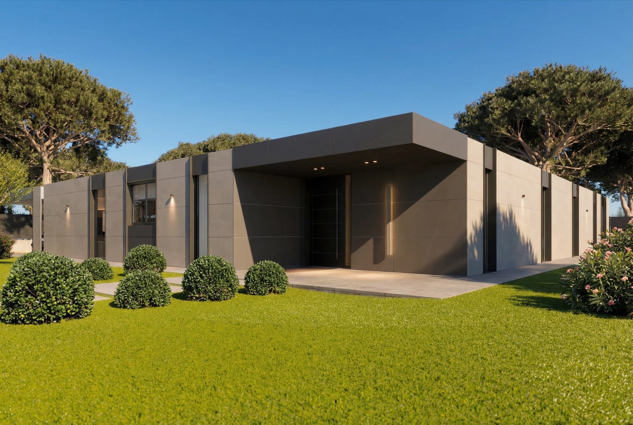 NOOR est une maison de plain-pied en forme de L, conçue pour s'intégrer naturellement à son environnement et sublimer la vie en extérieur. Sa géométrie ouverte permet d'articuler le programme fonctionnel autour du jardin et de la piscine, créant une relation harmonieuse entre intérieur et extérieur. Au cœur de la maison se trouve un espace ouvert abritant le salon, la salle à manger et la cuisine, avec de grandes fenêtres coulissantes donnant directement sur la véranda. Cette disposition crée une atmosphère lumineuse et relaxante, idéale pour la vie quotidienne ou pour profiter des moments conviviaux. Dans l'aile la plus intime, les chambres donnent sur le jardin, garantissant tranquillité et vue dégagée. La suite parentale offre une atmosphère sereine avec sa salle de bain et son dressing, tandis que les pièces annexes complètent l'ensemble avec équilibre et fonctionnalité. NOOR est un projet aux lignes épurées, aux matériaux chaleureux et aux espaces bien pensés, conçu pour ceux qui apprécient le contact avec la nature, l'efficacité et l'harmonie.