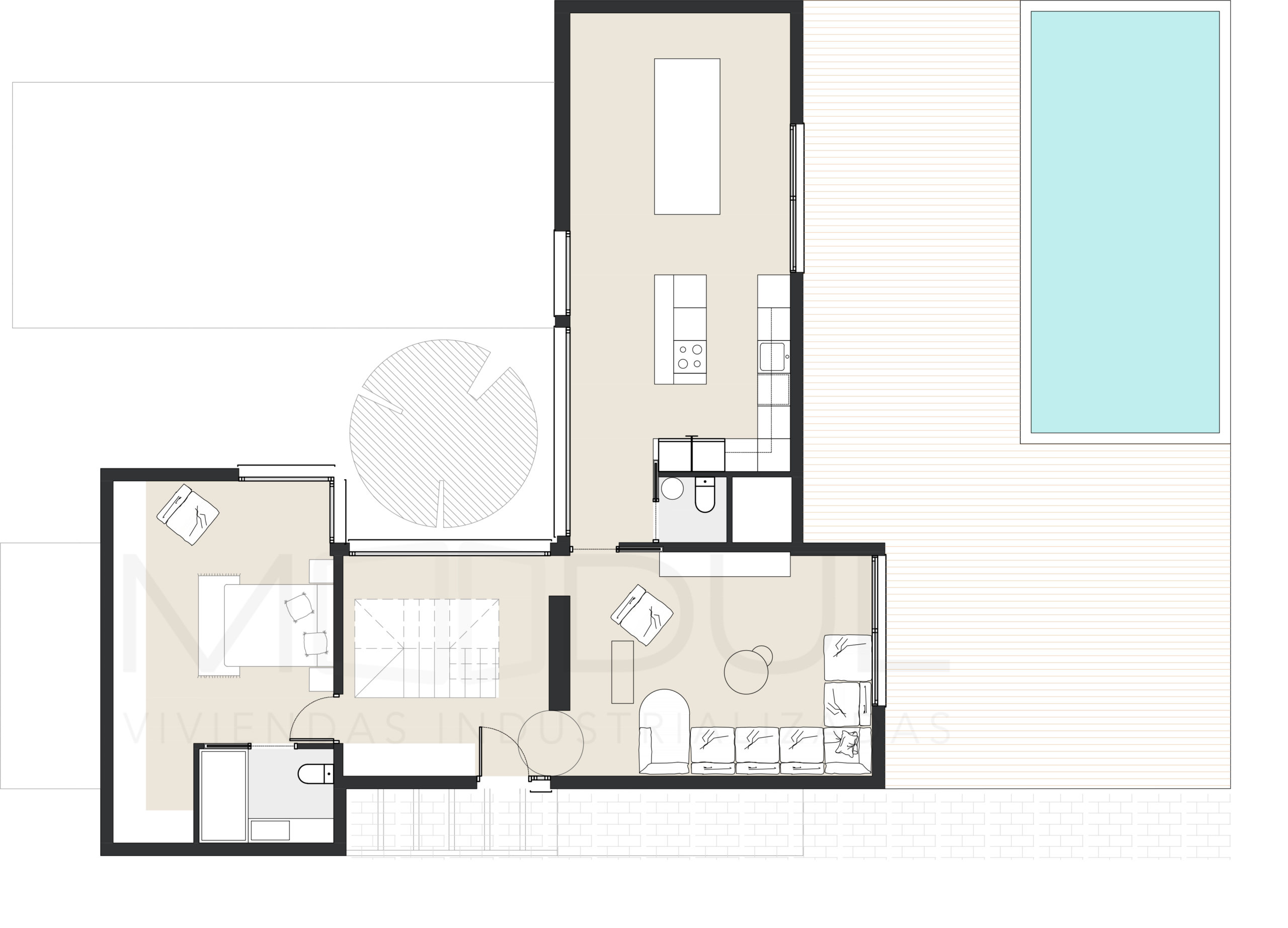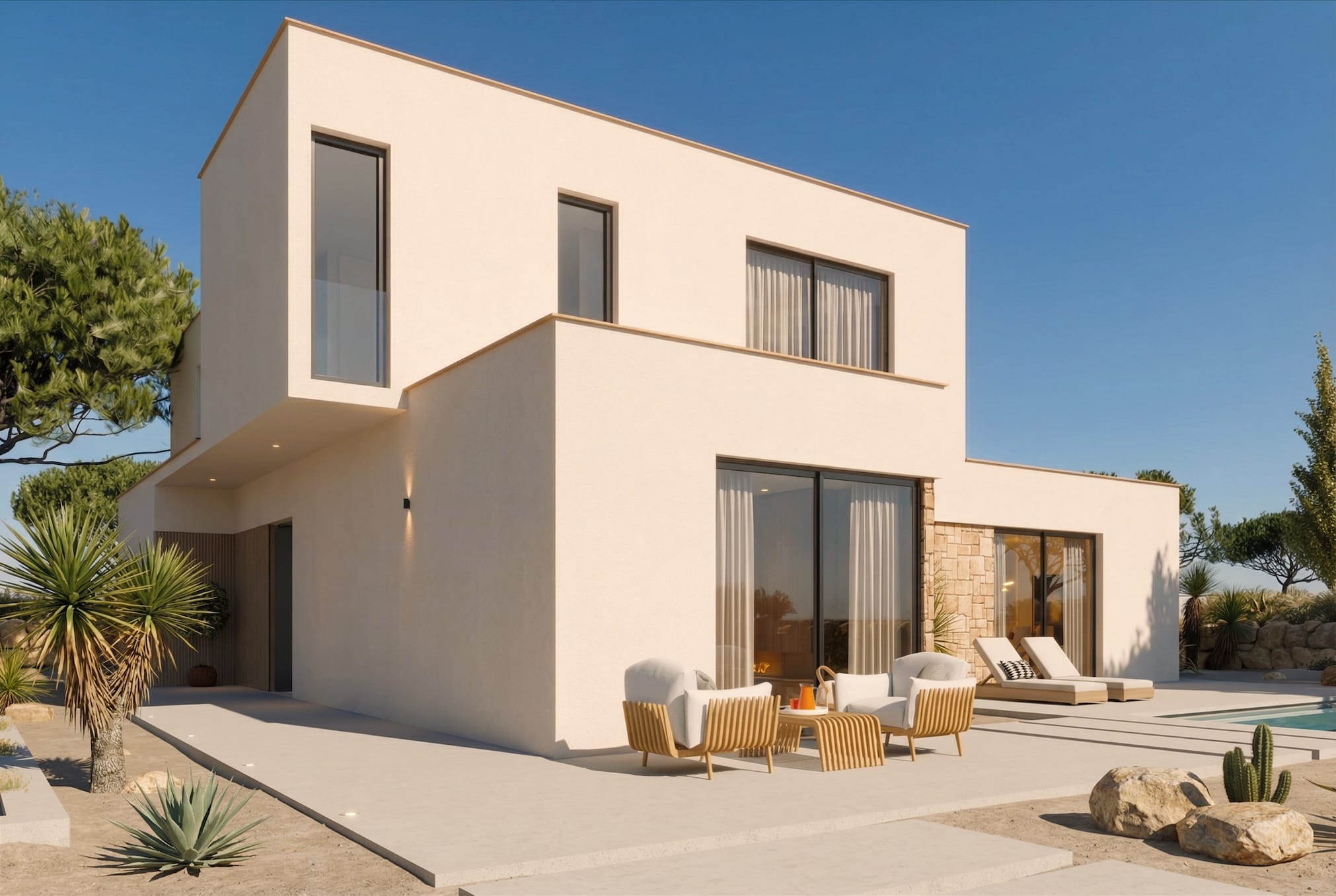 «ARENA es una vivienda de dos plantas que combina una geometría única con una distribución pensada para ofrecer fluidez y amplitud en cada rincón. Su arquitectura se articula en torno a espacios diáfanos que integran salón, comedor y cocina, generando un ambiente continuo donde la luz natural y la conexión con el exterior son protagonistas. La planta baja se despliega de manera abierta, con grandes ventanales que vinculan los espacios interiores con el porche y el jardín. La estructura de la vivienda está diseñada estratégicamente para acoger un porche con parking integrado, combinando funcionalidad, protección y estética sin comprometer la armonía de los volúmenes. La planta superior alberga la zona de descanso para garantizar privacidad y confort. ARENA es una propuesta que une geometría, fluidez y comodidad. Una casa pensada para quienes valoran la continuidad entre espacios, la luz natural y una experiencia de vida donde interior y exterior se funden en perfecta armonía.»
