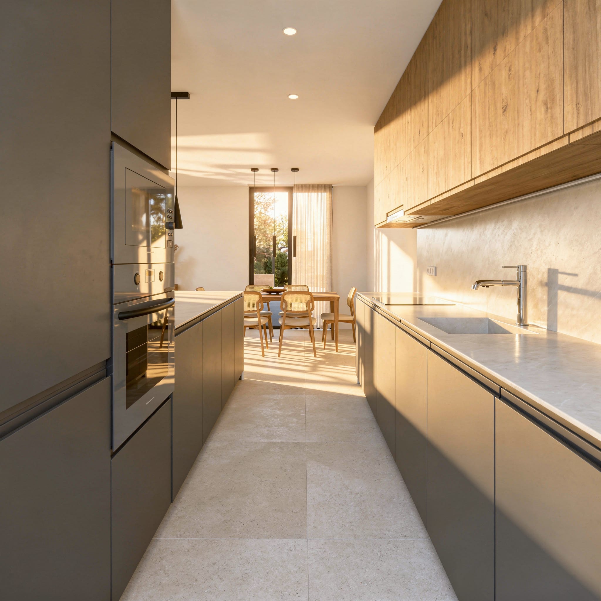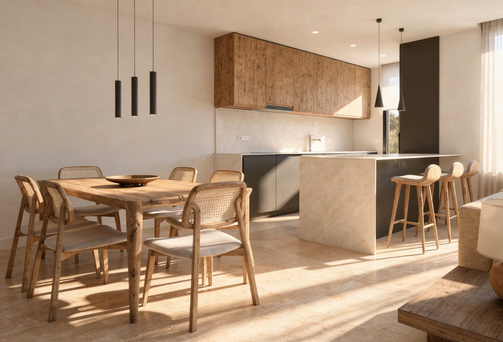 SIERRA est une maison de plain-pied en forme de T, conçue pour offrir une réponse architecturale claire à son environnement. L'orientation et la disposition visent à préserver l'intimité de la rue et à ouvrir la maison sur l'intérieur de la parcelle, où la vie quotidienne se déroule en lien direct avec le jardin et la piscine. Le volume principal, orienté transversalement, agit comme une barrière visuelle et climatique vers l'extérieur, tandis que le corps longitudinal qui le traverse concentre les pièces principales autour du jardin. Cette configuration permet à chaque espace de profiter de la lumière naturelle, de vues dégagées et d'une ventilation transversale, sans compromettre l'intimité. Le salon, la cuisine et la salle à manger communiquent dans un espace ouvert avec un accès direct à l'extérieur. L'espace nuit est stratégiquement situé sur l'un des bras du T, garantissant isolation phonique et sérénité. Des matériaux naturels, des lignes épurées et une palette sobre complètent l'identité sereine et équilibrée de la maison. SIERRA est une maison qui protège et s'ouvre, organisant la vie vers l'intérieur sans perdre le lien avec son environnement. Une proposition sobre et fonctionnelle parfaitement adaptée à la parcelle.