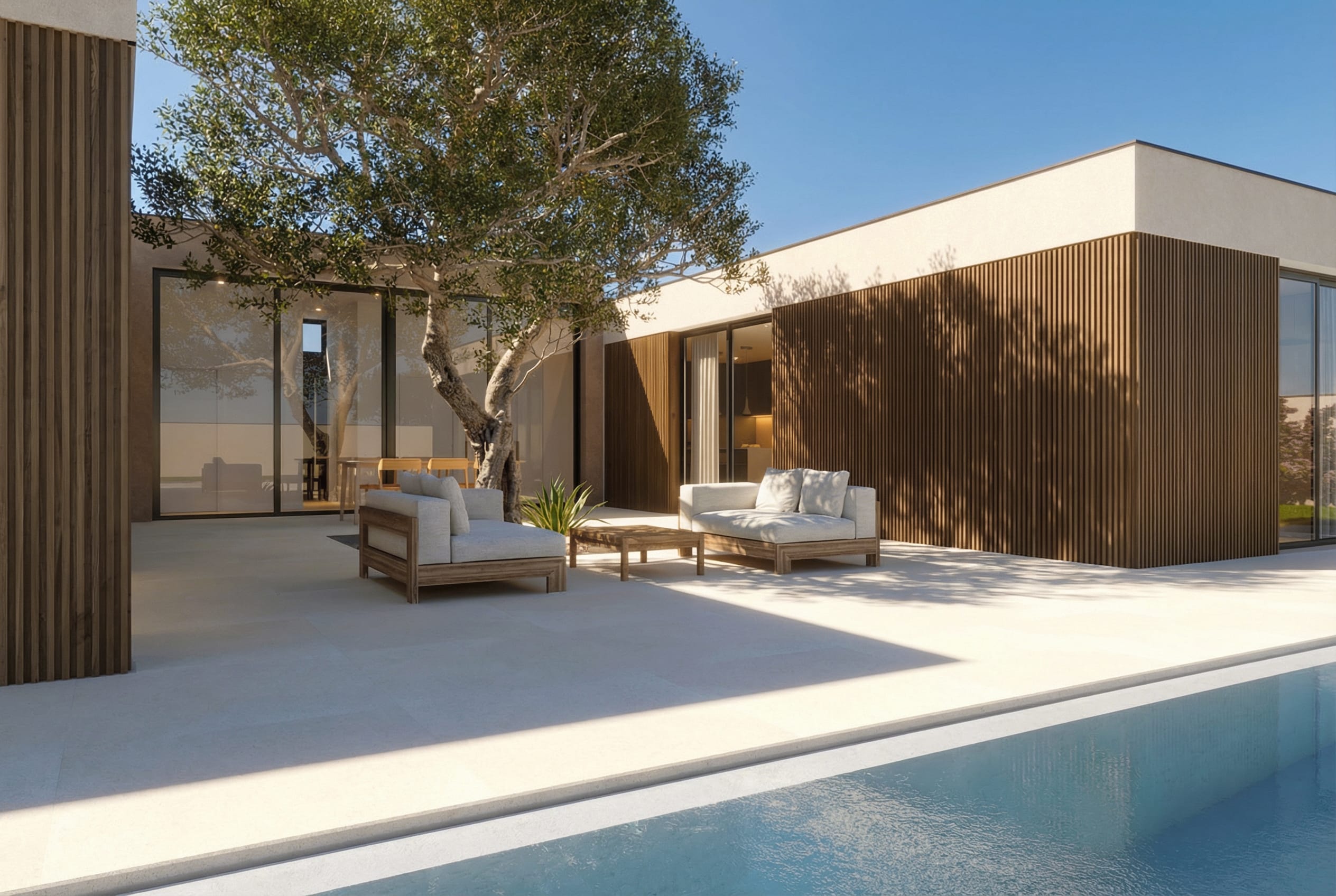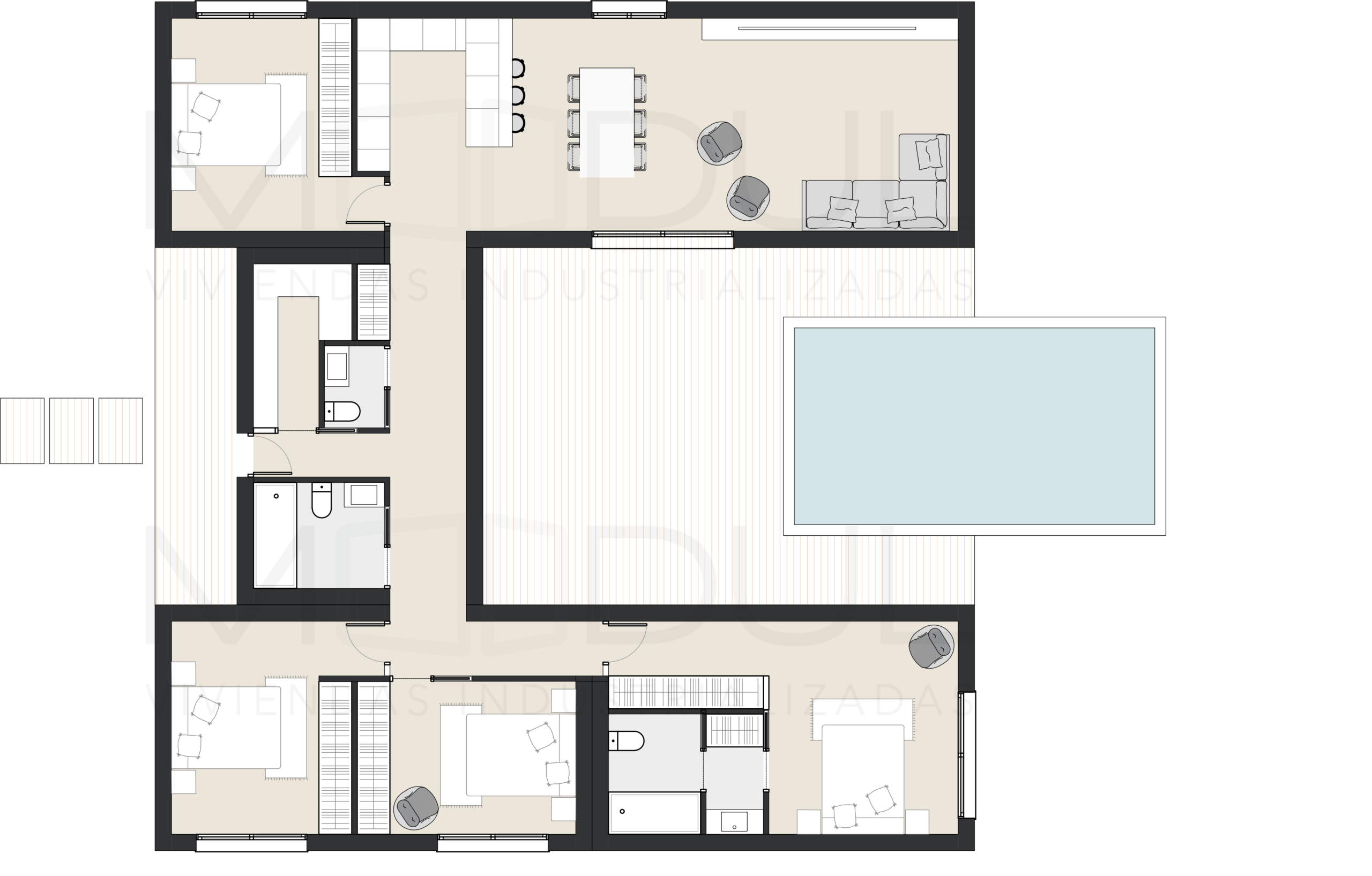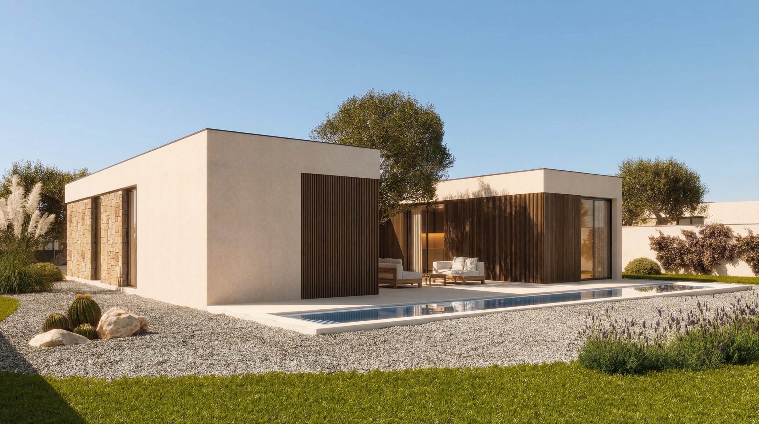 ZARA es una vivienda de una sola planta pensada para aprovechar al máximo las parcelas más contenidas. Su diseño compacto y racional ofrece una solución elegante y funcional para quienes valoran la simplicidad bien resuelta y una estética contemporánea cuidada. La organización interior permite una clara separación entre las zonas de día y de noche, con un espacio central abierto que integra cocina, comedor y salón, vinculado directamente al exterior mediante ventanales que favorecen la entrada de luz natural. El uso de revestimientos en madera sintética en fachada aporta textura, calidez y personalidad al conjunto, en contraste con los tonos neutros del resto del volumen. Esta combinación refuerza la identidad de la vivienda sin recurrir a excesos formales. ZARA es una casa bien proporcionada, versátil y cómoda. Una propuesta arquitectónica que demuestra que el diseño inteligente también puede habitar espacios pequeños con estilo y carácter.