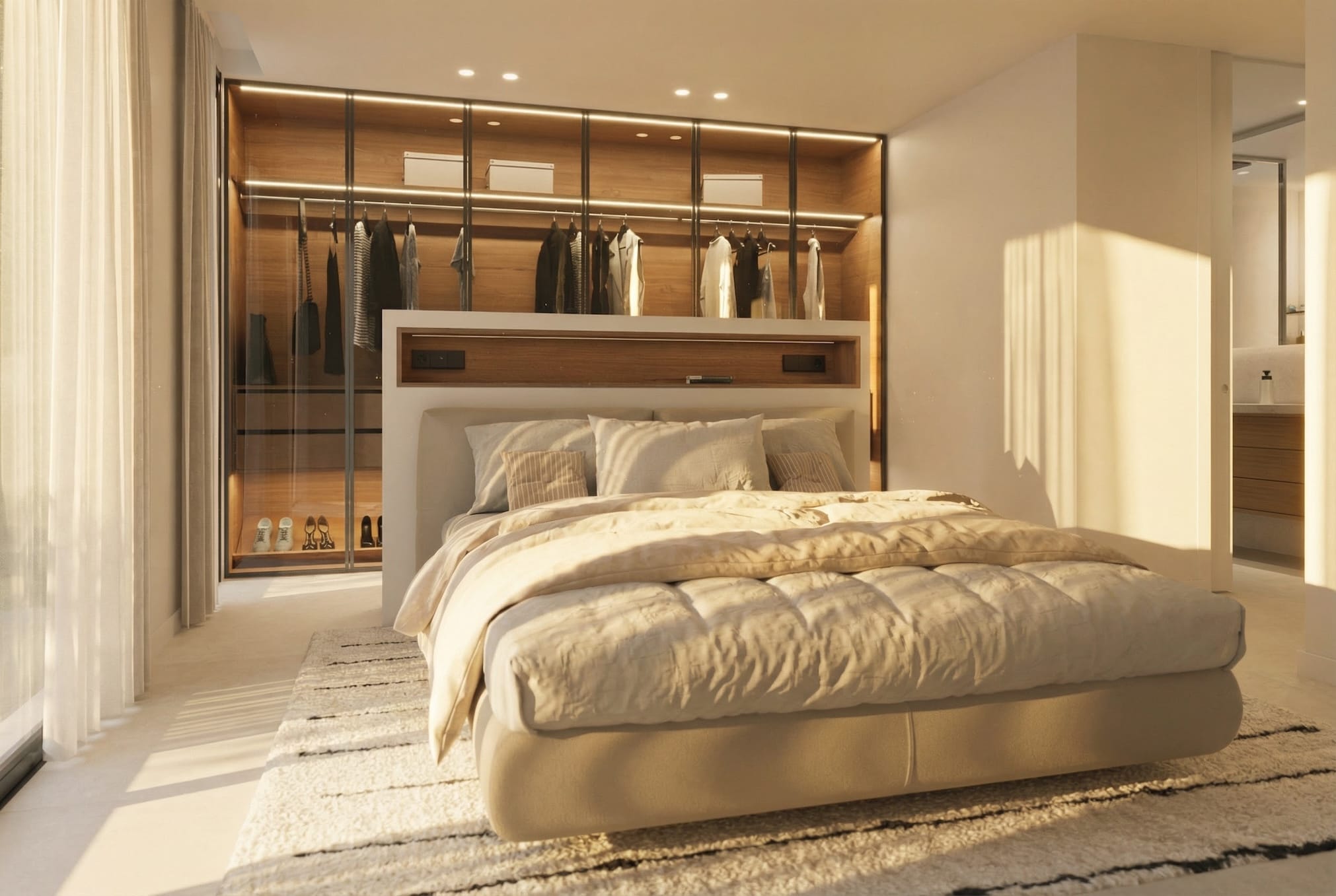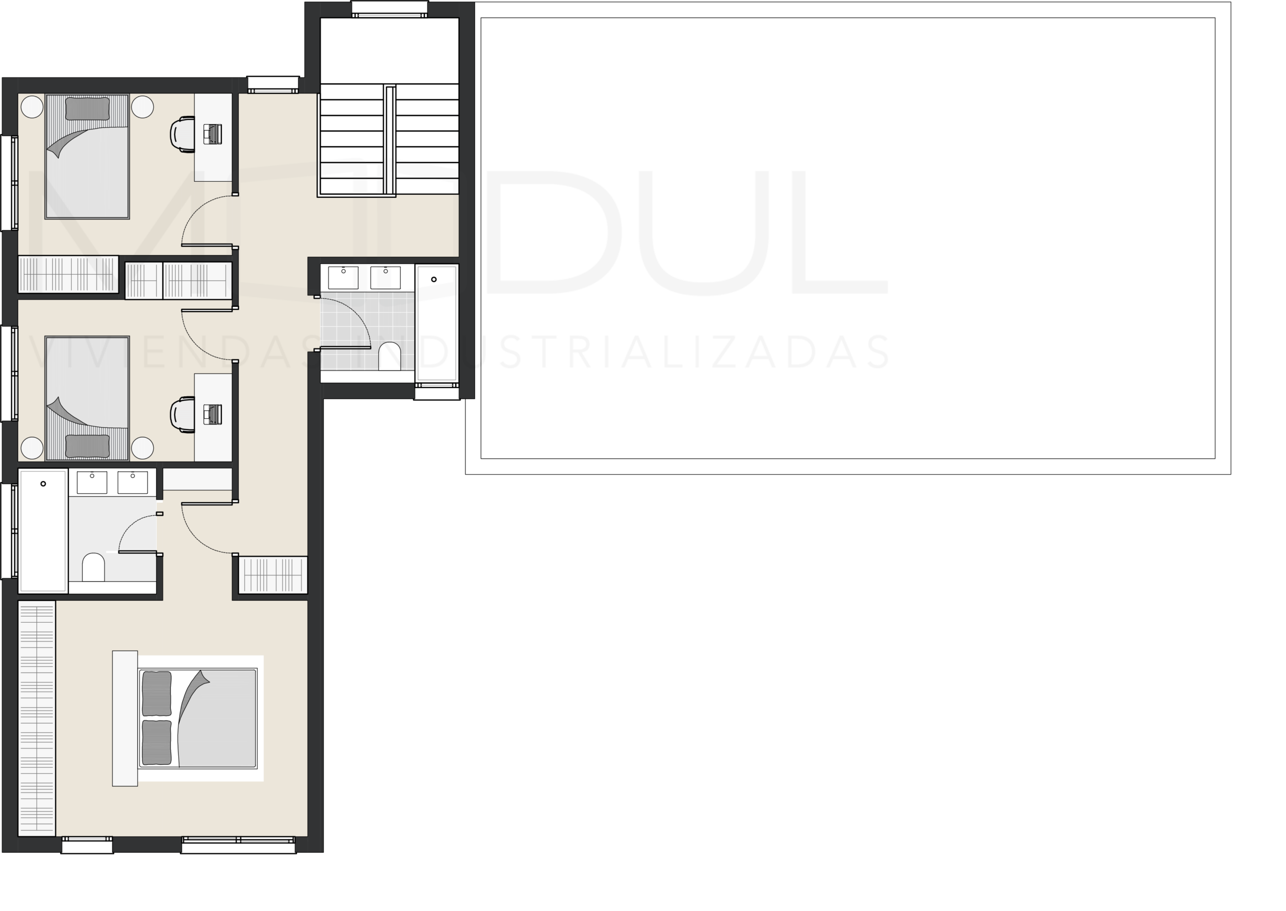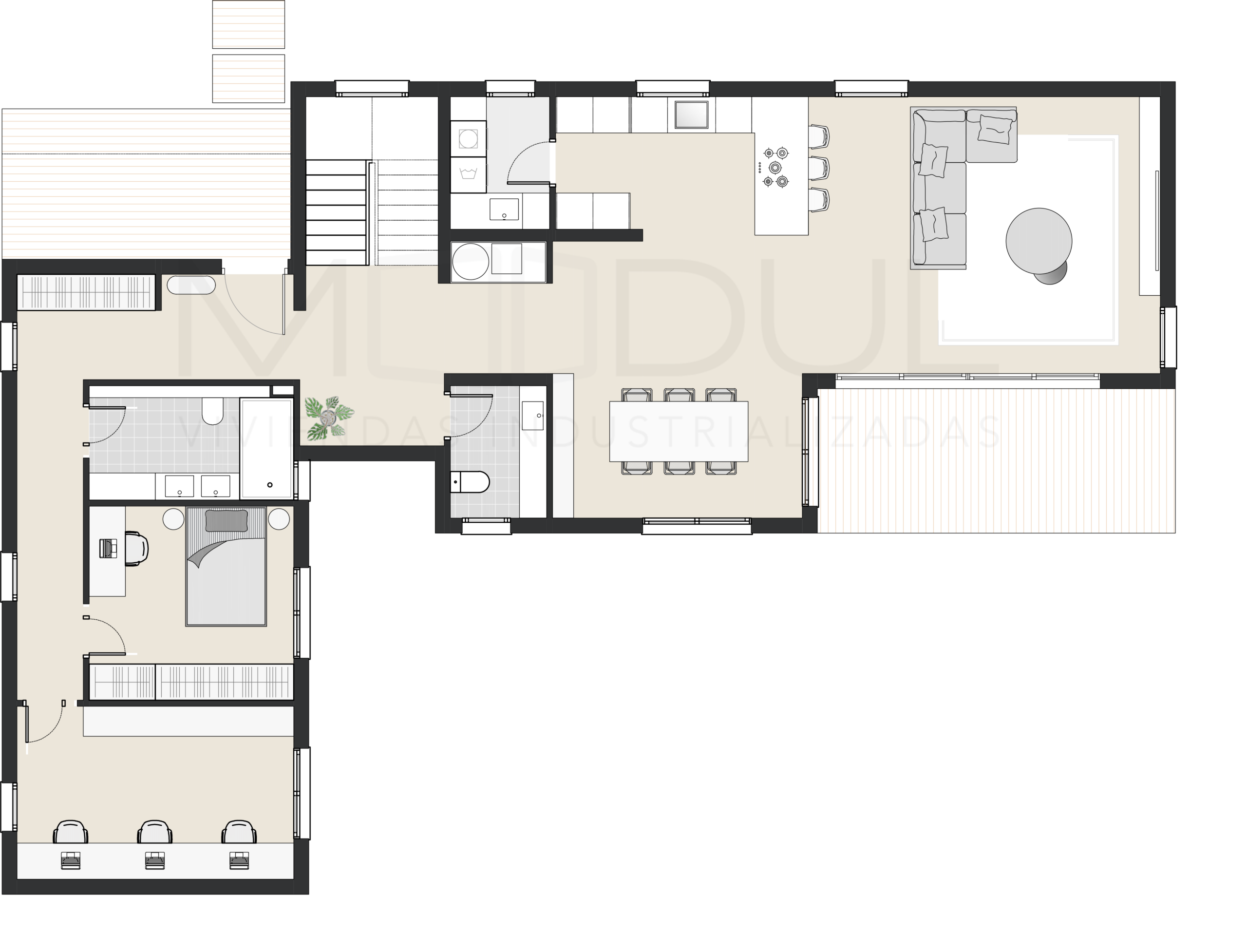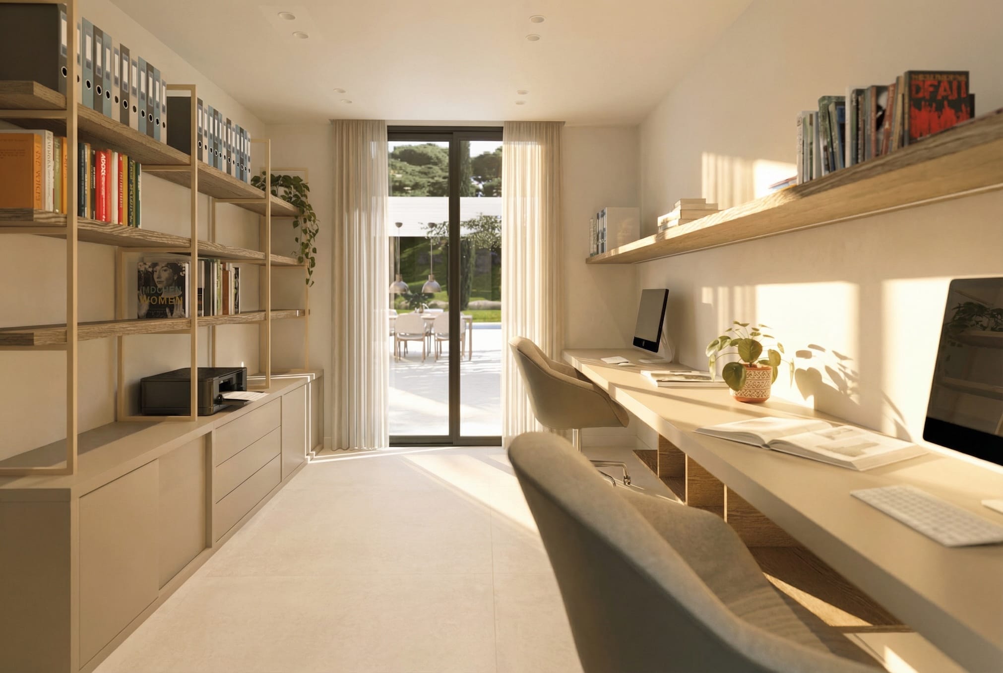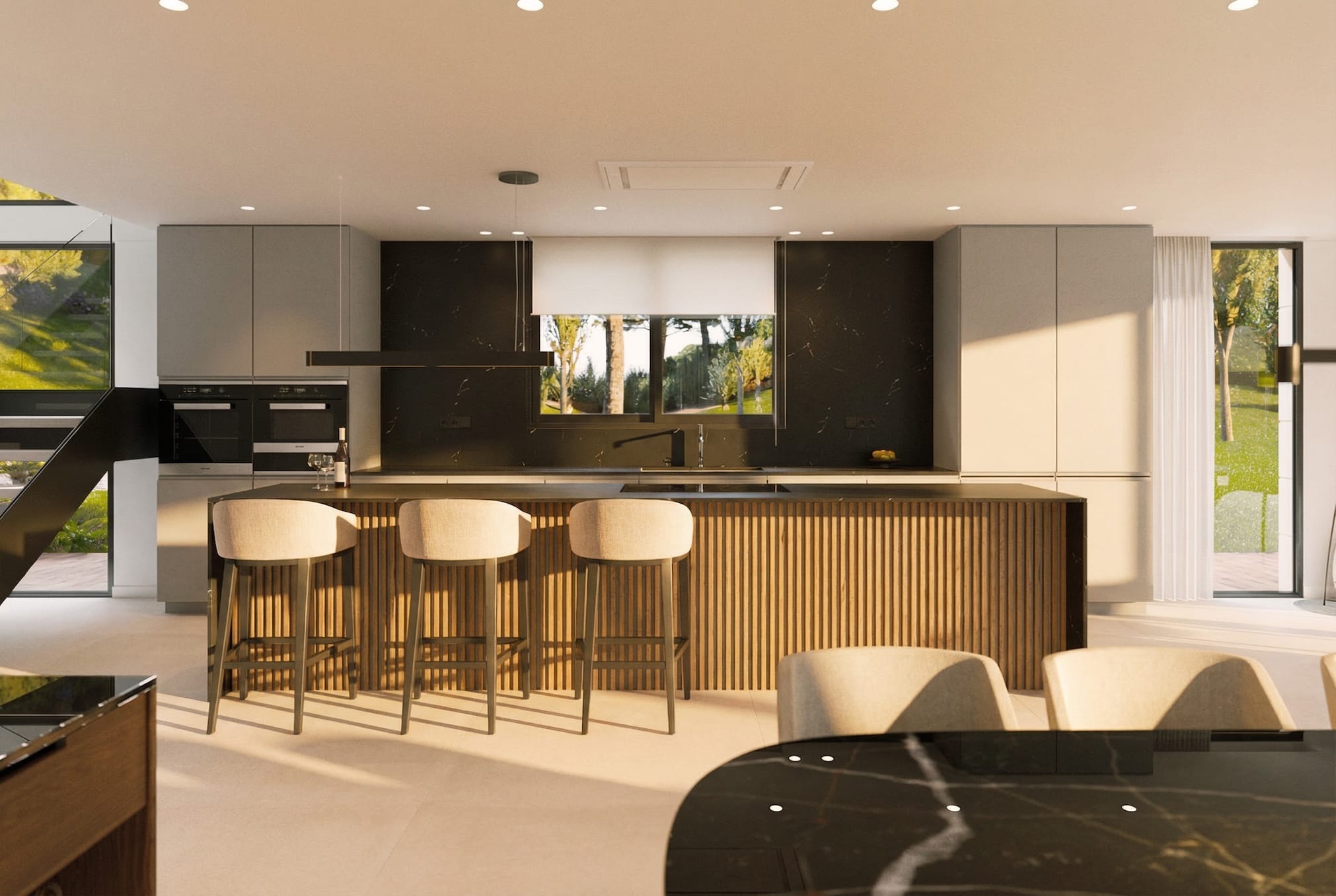 VITA es una casa de dos plantas que reinterpreta la arquitectura mediterránea con una estética cálida y contemporánea. El uso combinado de madera y tonos naturales confiere al conjunto un equilibrio entre tradición y modernidad, resaltando su integración con el entorno. La planta baja acoge la vida diaria con una distribución fluida: cocina, comedor y salón se conectan en un espacio abierto que se prolonga hacia el exterior a través de una terraza y zona ajardinada. Grandes ventanales favorecen la entrada de luz natural y crean una relación directa con el paisaje inmediato. La planta superior ha sido cuidadosamente diseñada para ofrecer las mejores vistas desde las estancias privadas. La orientación estratégica de cada dormitorio permite disfrutar del entorno, maximizando la privacidad y la luz natural. La suite principal se abre a una terraza elevada, convirtiéndose en un refugio íntimo con perspectiva despejada. VITA es una casa pensada para quienes valoran la conexión con el paisaje, la funcionalidad y la belleza esencial de la arquitectura mediterránea, reinterpretada desde una mirada actual.